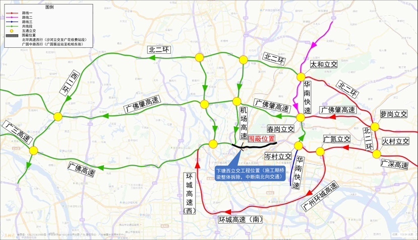 2月17日,广州日报新花城记者从广州市中心区交通项目管理中心了解到,根据施工计划,广园路下塘西路立交大修工程将于近期分四次(分别为2月23日、3月3日、3月12日、3月15日的凌晨0:00~6:00)临时中断北环高速和广园中路部分路段交通,开展跨北环高速桥梁拆除围蔽施工。