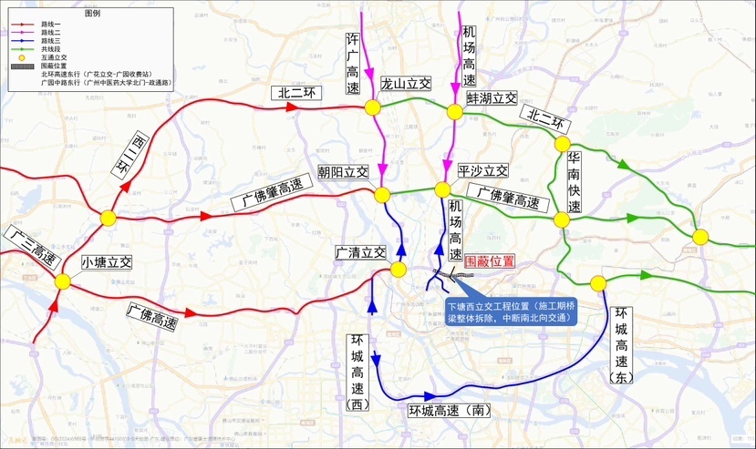 路线一:广三高速→小塘立交→西二环→北二环;广佛高速→广清立交→许广高速→广佛肇高速