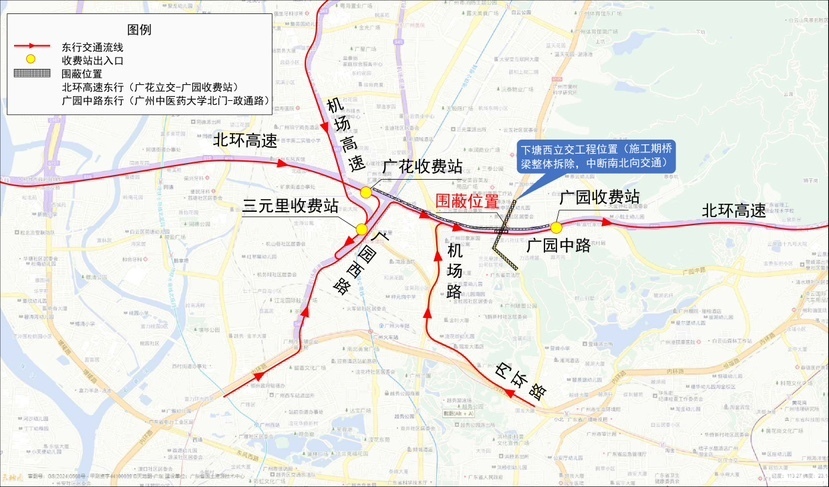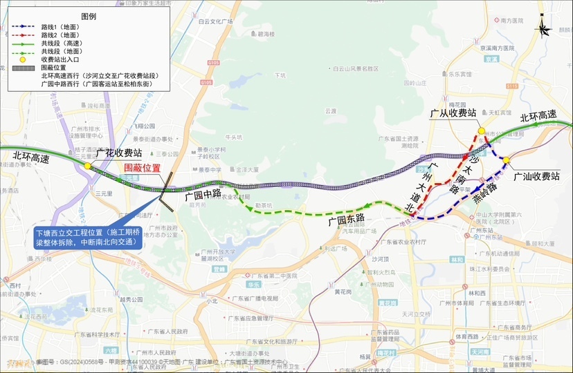 二、3月3日、3月15日凌晨0:00至6:00,临时中断西行方向北环高速(广汕出口至广花入口路段)和广园中路(广园客运站至松柏东街路段)西行交通