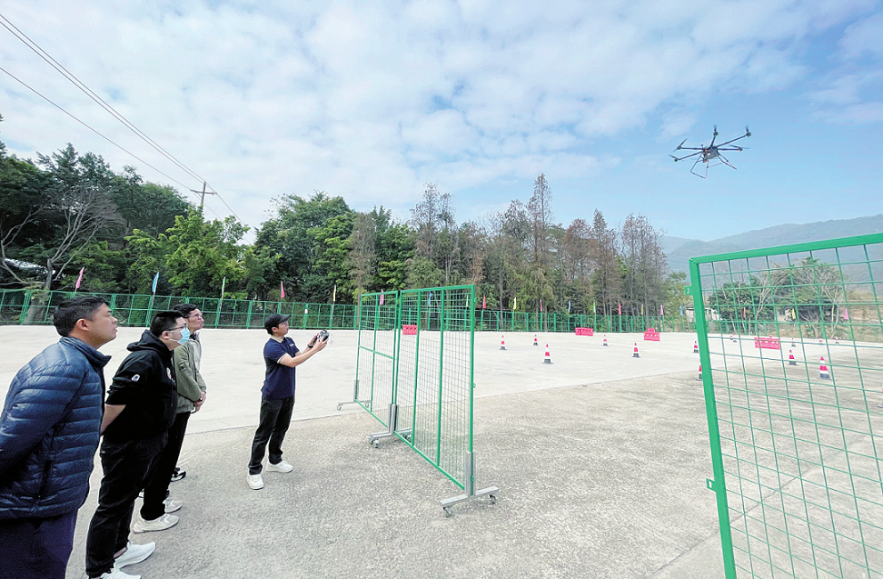 起飞、悬停、飞行、降落……位于肇庆市鼎湖区坑口街道的能飞无人机学院肇庆分校的室外培训场地上,在教练的带领下,多名学员正在进行小型无人机实操学习。