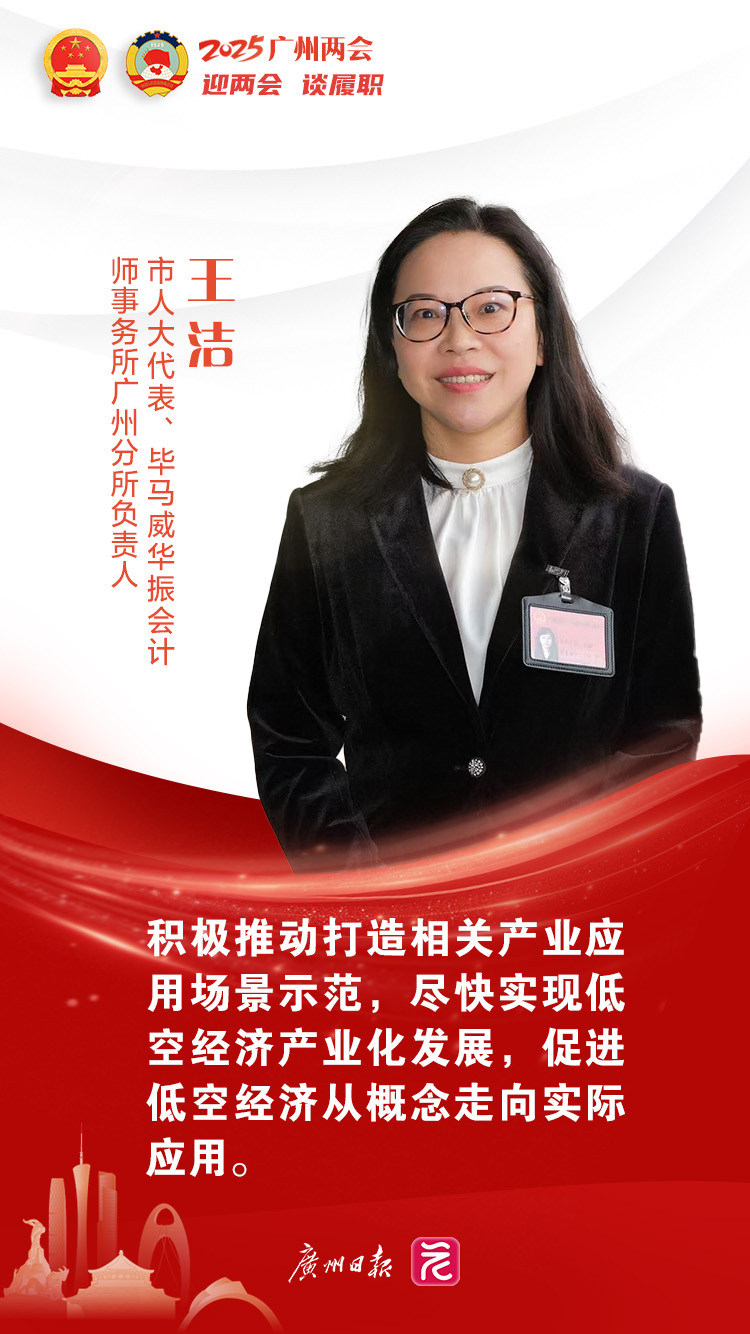 此前,广州市人民政府办公厅印发《广州市低空经济发展实施方案》。《方案》提出,到2027年,广州低空经济整体规模达到1500亿元左右。今年两会,广州市人大代表、毕马威华振会计师事务所(特殊普通合伙)广州分所党委书记、分所负责人王洁结合自身专业重点关注广州低空经济发展,积极建言献策。