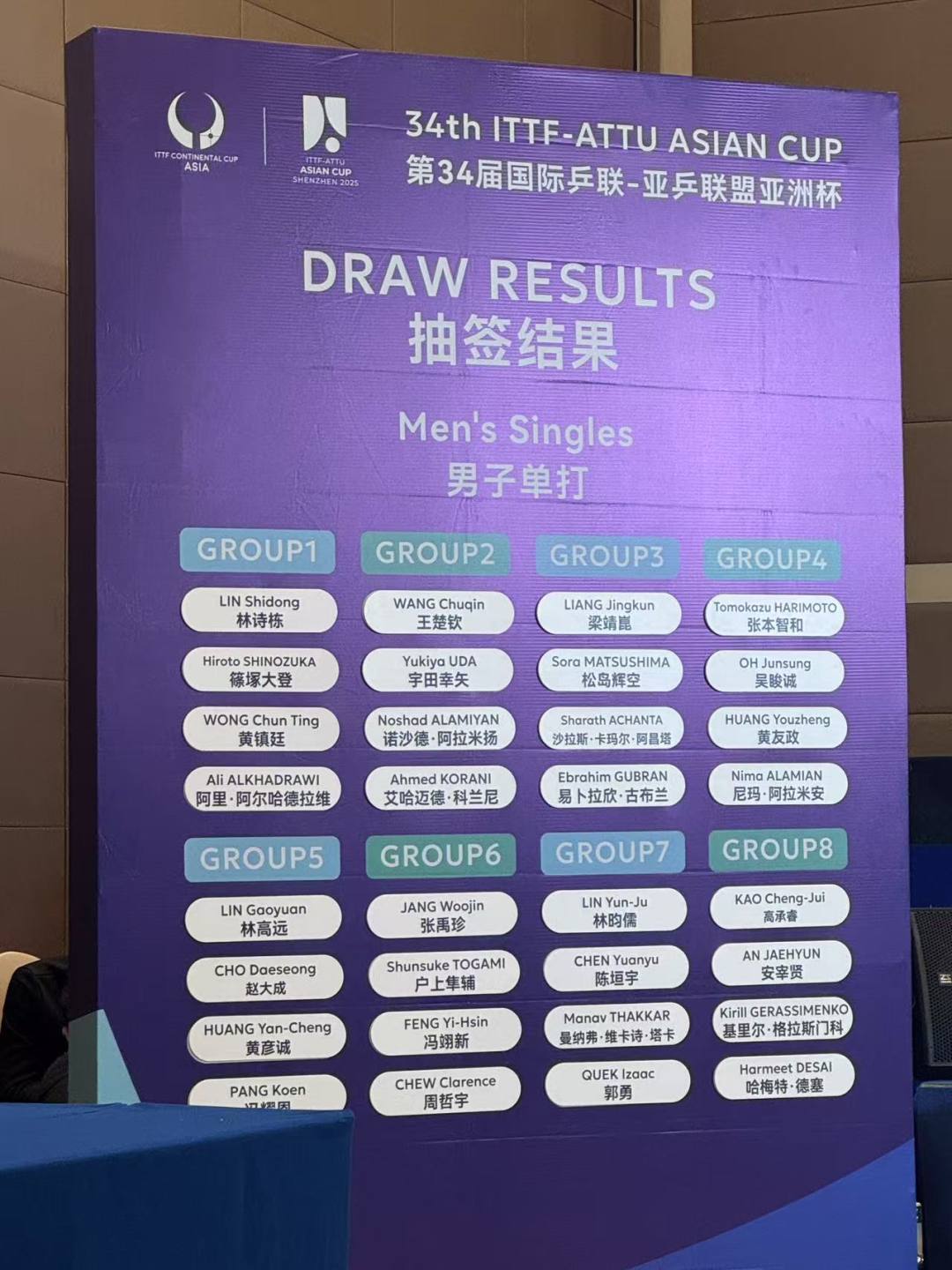 2025乒乓球亚洲杯男单第一阶段分组
