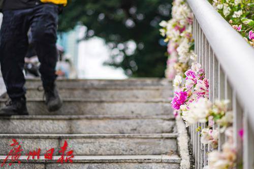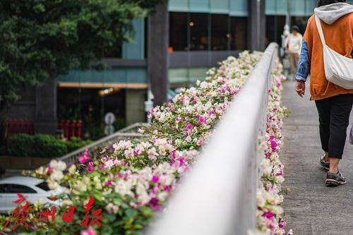 开满鲜花的天桥,成了不少过路人拍照打卡的背景板。
