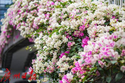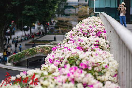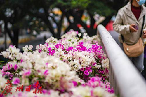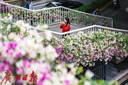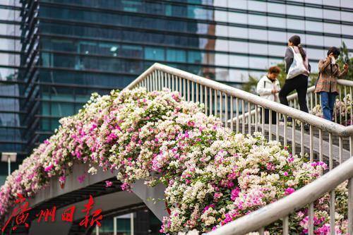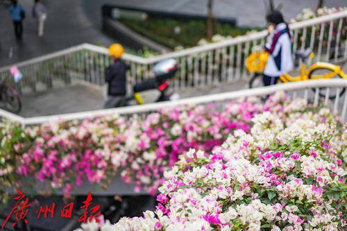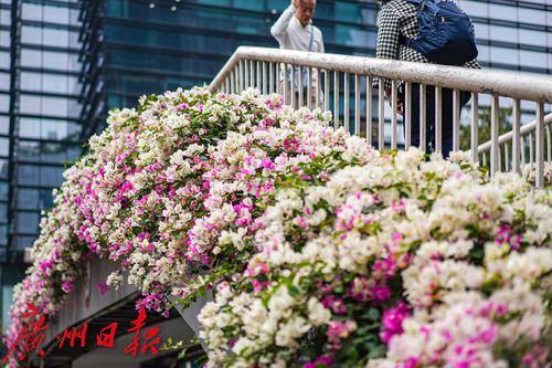行人走在天桥上,目光被两侧盛开的粉白色簕杜鹃吸引。