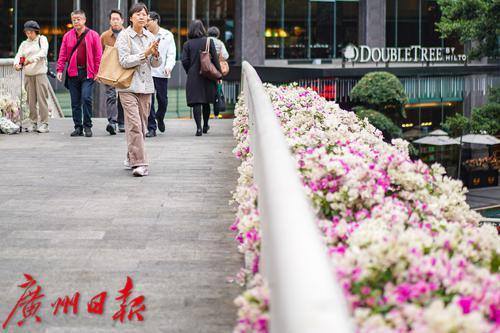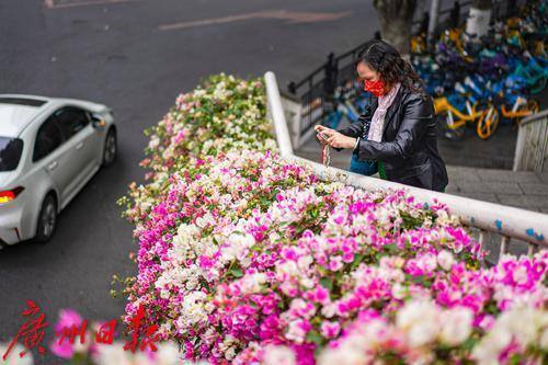路过市民站在布满粉白色簕杜鹃的栏杆旁,专注地用手机拍照。