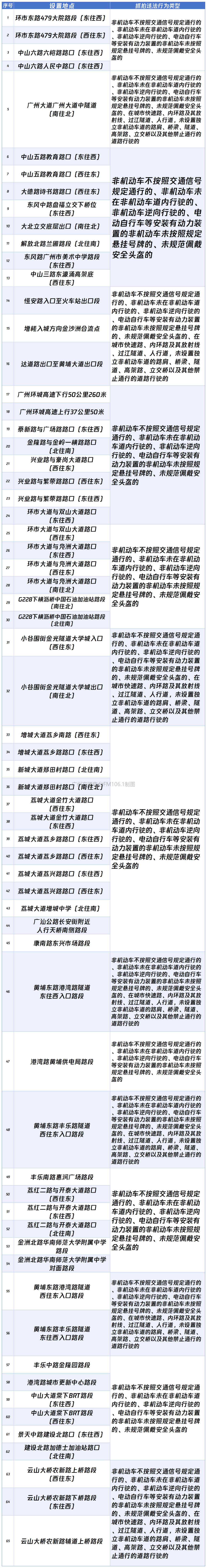 为进一步加强城市道路交通安全管理工作,保障道路交通安全、畅通、有序,广州交警新增电动自行车交通违法行为抓拍取证点位65个(具体点位见下图),对电动自行车不按照交通信号规定通行、未在非机动车道内行驶、逆向行驶、未按照规定悬挂号牌、在没有非机动车道的道路上不靠车行道右侧行驶等交通违法行为进行抓拍取证,并短信告知违法当事人配合调查处理。
