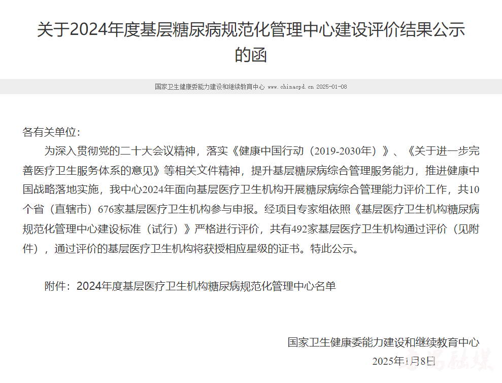 近日,记者从国家卫生健康委能力建设和继续教育中心获悉,在2024年度基层糖尿病规范化管理中心评价中,番禺区桥南街社区卫生服务中心凭借在糖尿病规范化管理方面的扎实工作和突出表现,获评为糖尿病规范化管理中心“二星门诊”,是广州市唯一一家获评的机构。
