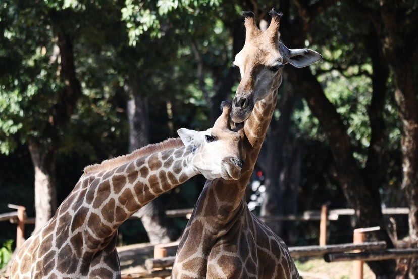 在长颈鹿展区,长颈鹿出双入对,交颈厮磨。雄鹿主动用长脖反复轻触雌鹿传递“爱意”,它们相互依偎,上演了充满萌趣的“求偶大戏”。