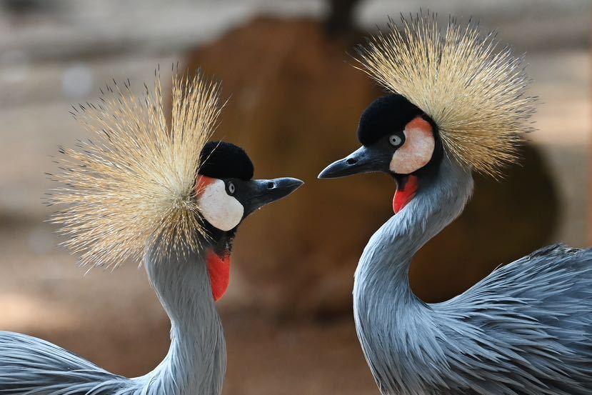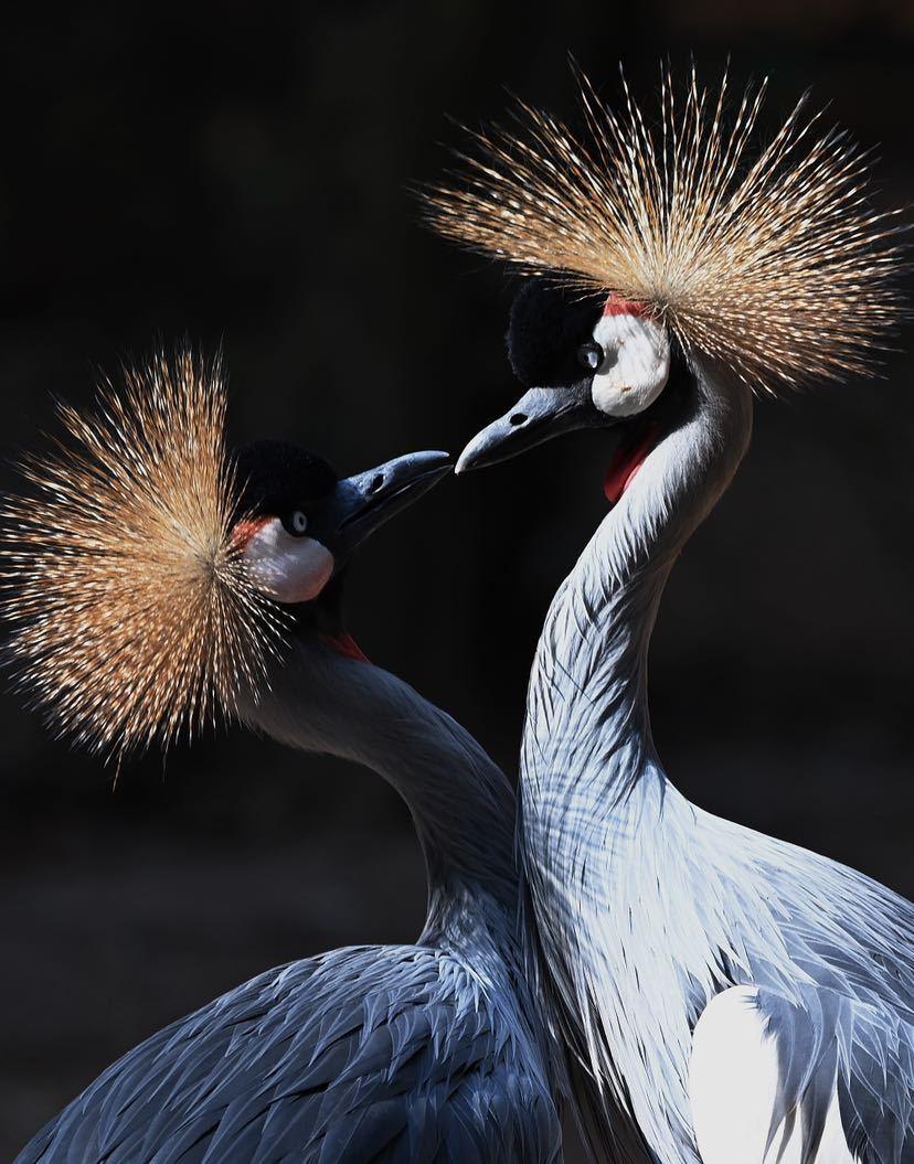 动物园湿地园里的东非冠鹤似乎感受到春天的气息,东非冠鹤天生丽质,枕部有由无数条土黄色绒丝形成的绒球状冠羽,眼睛后方的面颊有上红下白的斑块,喉部有红色肉垂。它们翘首引领互相蹭头,张开翅膀翩翩起舞,并敞开喉咙欢快地鸣叫,仿佛对唱“情歌”,用独特的方式表达着它们的“情意”。