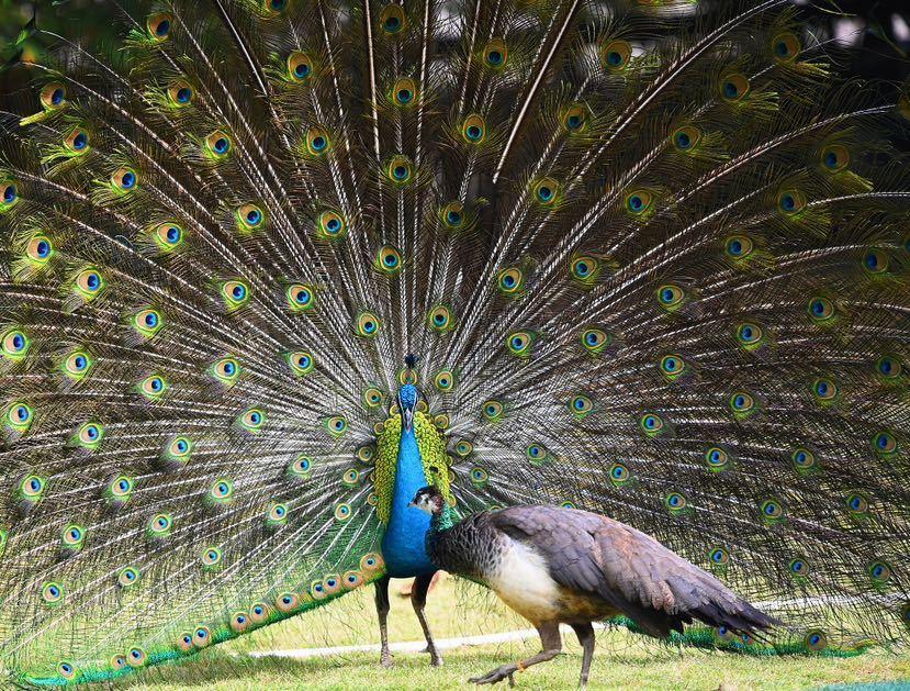 动物园里的孔雀园,数只雄性孔雀纷纷在各自“追求”的雌性孔雀面前频繁开屏,仿佛上演了一场花式秀恩爱比拼。雄孔雀为求得雌孔雀的“芳心”,尽情地展现其独有的“才艺”——左右摆动尾屏,上前几步,又随后几步,还绕着雌孔雀转圈,仿佛跳着优美“舞蹈”。