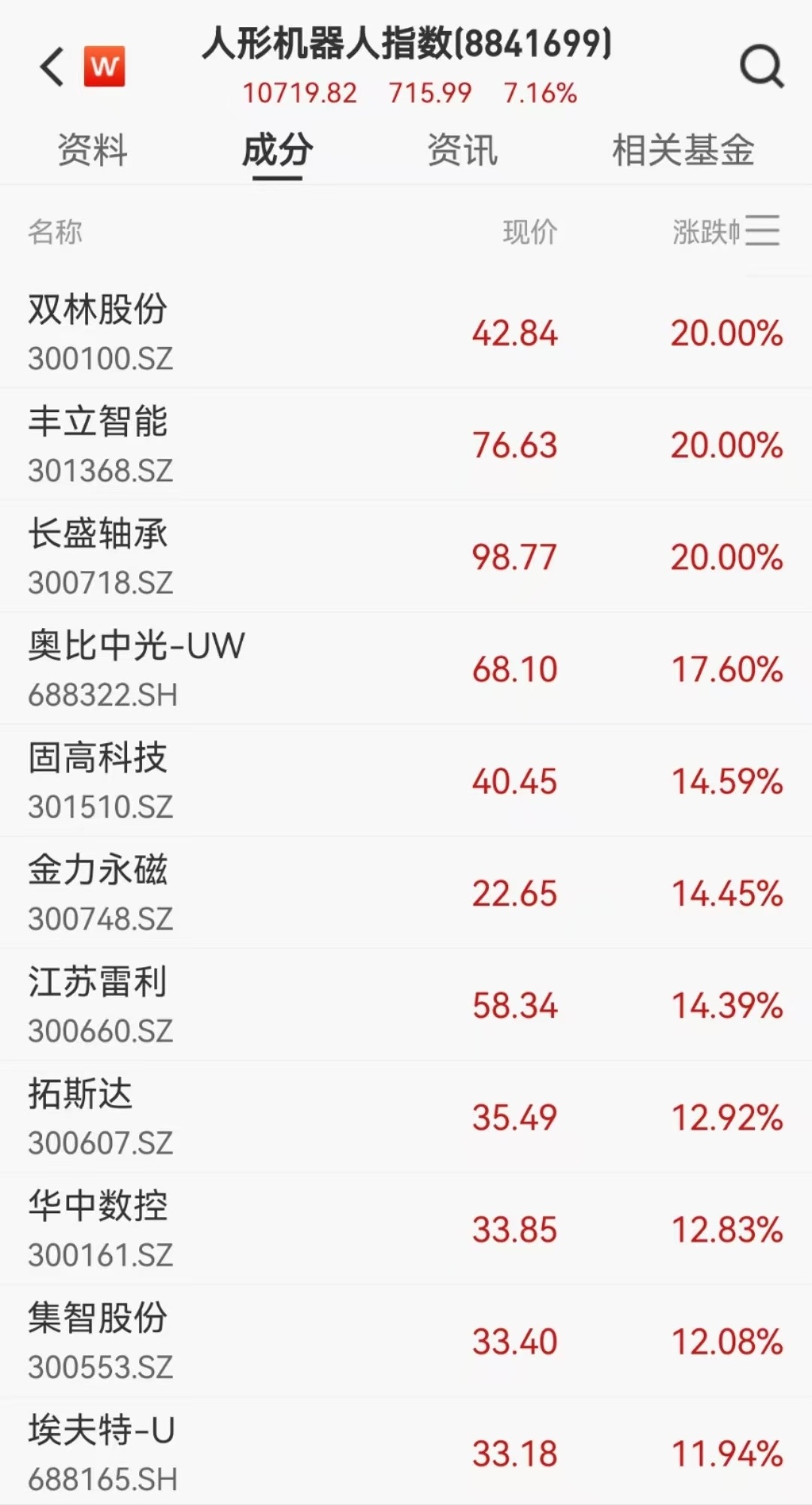 人形机器人概念股无疑是当日市场热点。宇树机器人方向领涨,三丰智能、平治信息、双林股份、长盛轴承、汉威科技等近20股涨停。此外,市场有消息称蚂蚁下场自研具身智能人形机器人。对此蚂蚁回应,蚂蚁确实在做具身智能。A股蚂蚁概念股午后异动拉升,奥比中光直线一度触及涨停,永安行、天源迪科、雄帝科技等股拉升。