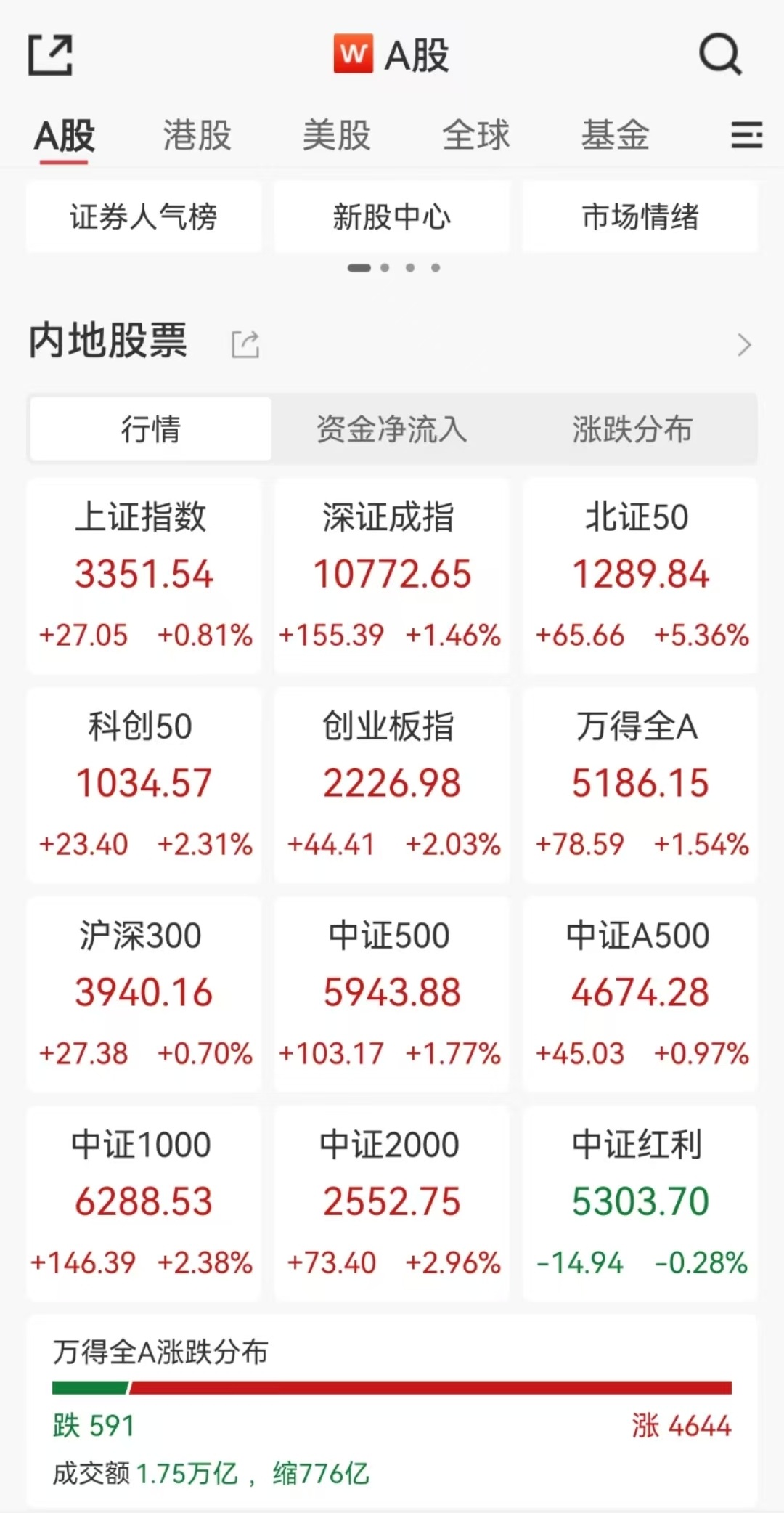 截至收盘,上证指数收涨0.81%报3351.54点,深证成指涨1.46%,创业板指涨2.03%。全日市场成交1.75万亿元,较上一个交易日缩量776亿元。