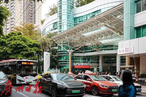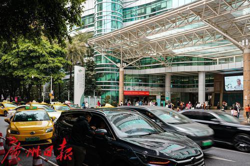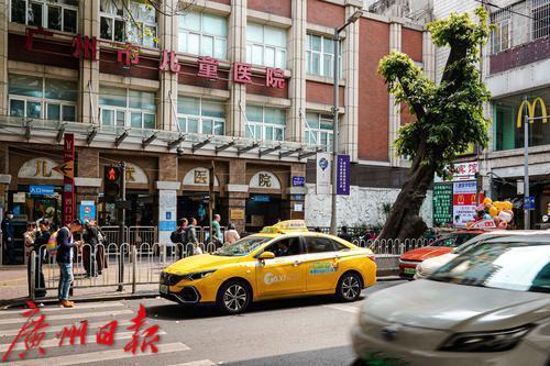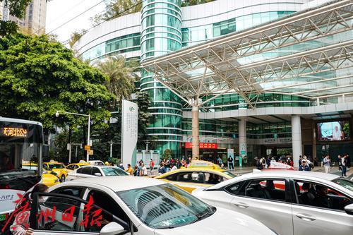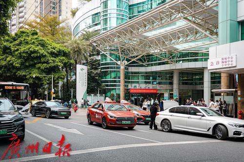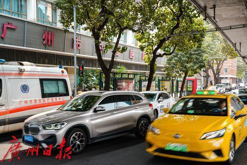 广东省中医院(大德路院区)门口划有大大的禁停区域,然而,临时停靠的车辆还是导致车流滞缓。临时停车的车辆以出租车、网约车为主,也有不少私家车,大都是为了短暂接送患者、家属,却也影响了道路的正常通行。