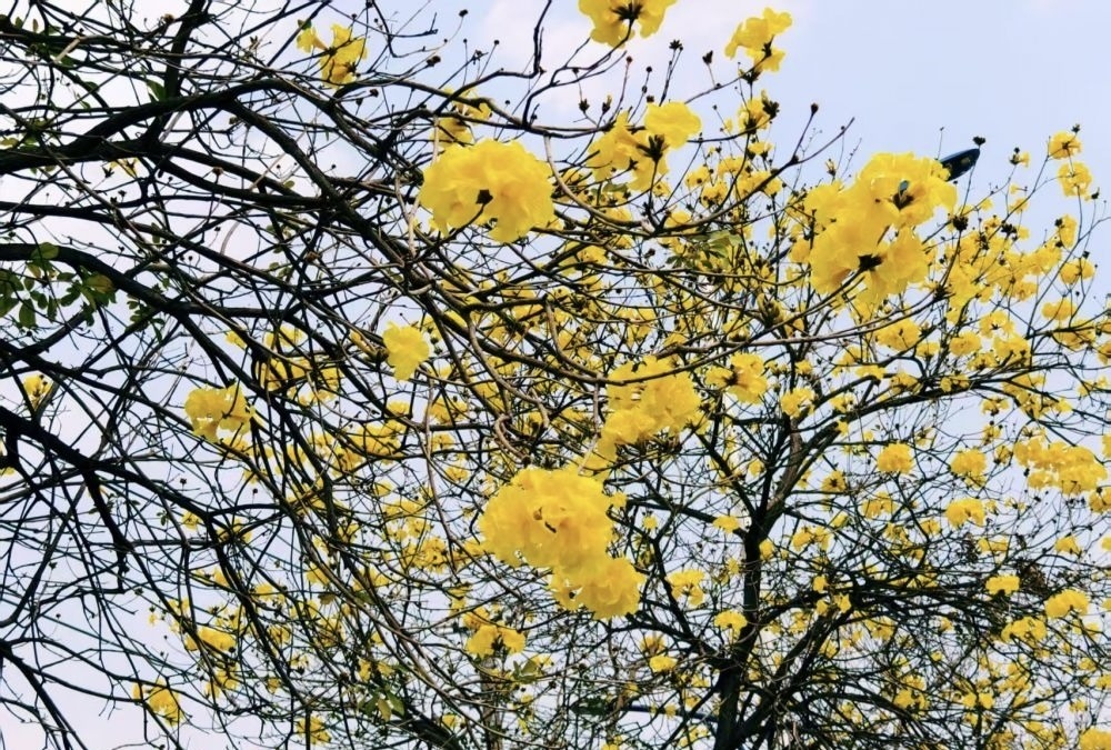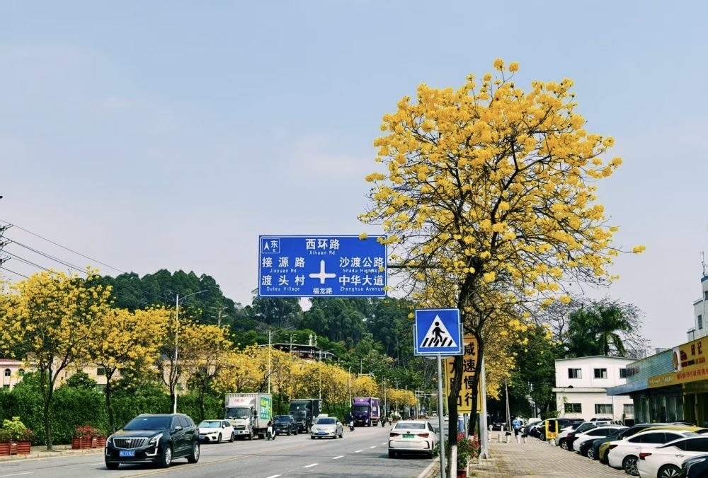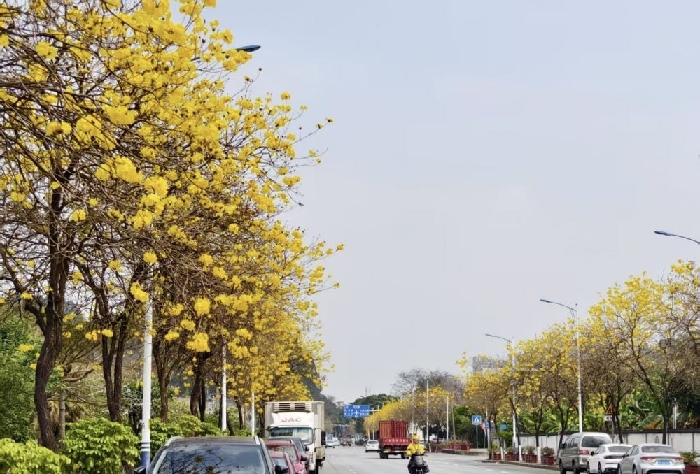 2月19日下午,记者来到沙湾街福龙路,仿若踏入了一个金色的梦幻之境。道路两旁,黄花风铃木尽情绽放,金色的花朵密密匝匝,挂满枝头,在微风中轻轻摇曳,似在诉说着春日的温柔。路上车辆川流不息,行人在树下悠然走过,与这烂漫的花海交织成一幅绚烂的春日盛景。