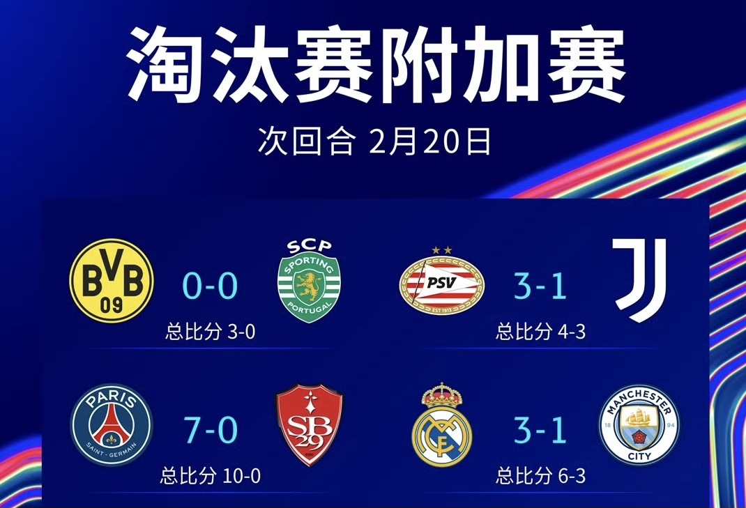 附加赛晋级球队:多特蒙德、皇家马德里、拜仁慕尼黑、埃因霍温、巴黎圣日耳曼、本菲卡、费耶诺德、布鲁日。