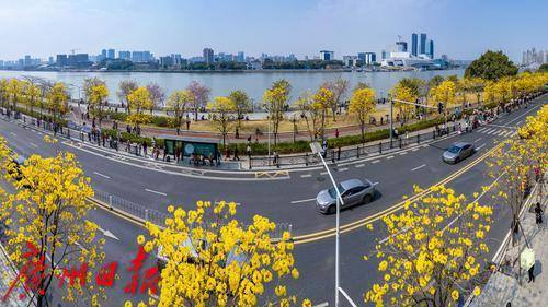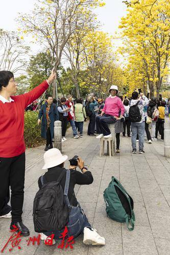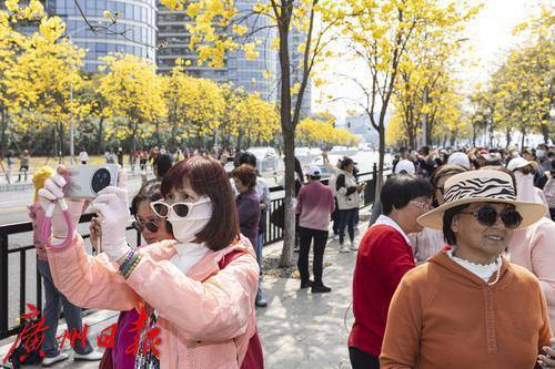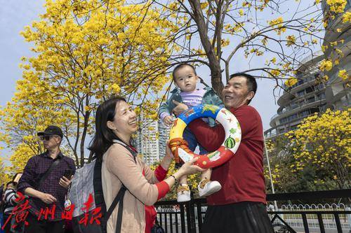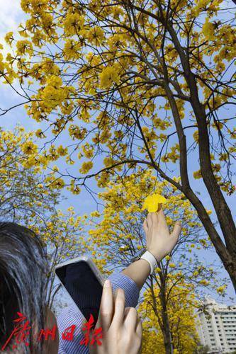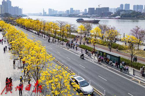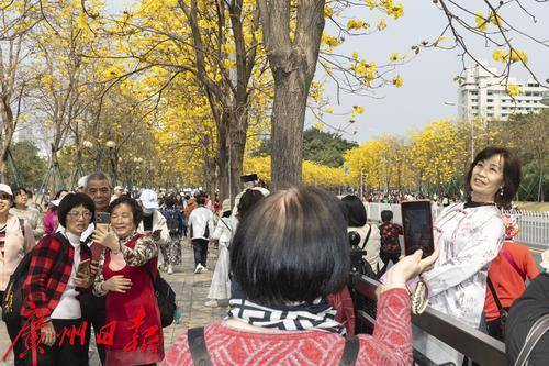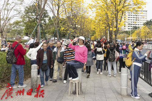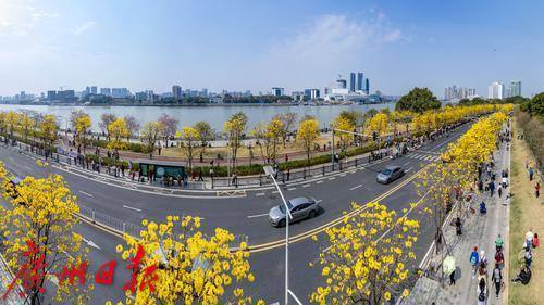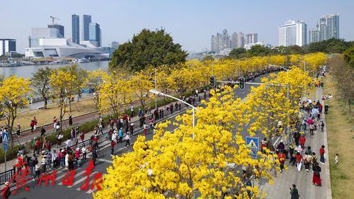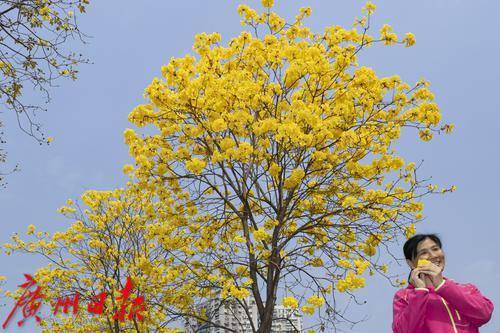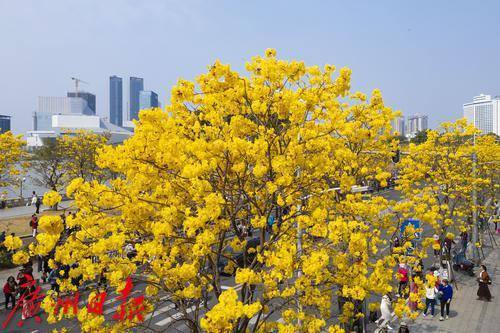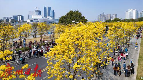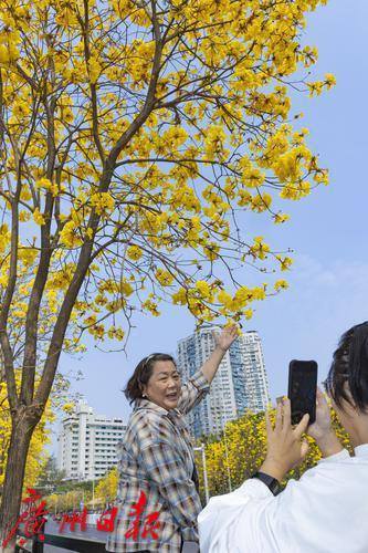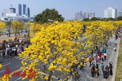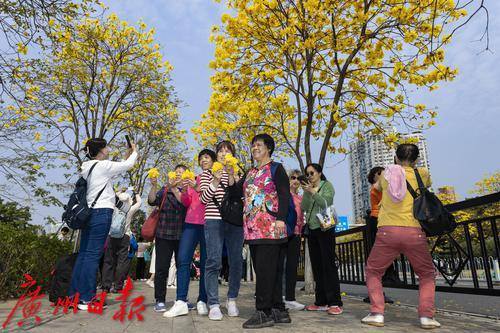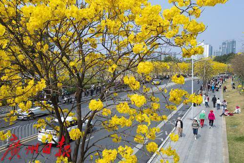 2025年2月20日,广州市洲头咀公园,黄花风铃木在蓝天下争奇斗艳,远观便如一条“黄金大道”,不少市民朋友前来拍照打卡。