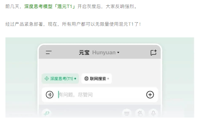 如今,腾讯元宝已成为“AI 聚合体”,用户不仅能借助DeepSeek-R1满血版与混元T1进行深度思考,还能用DeepSeek-V3、腾讯混元Turbo快速获取答案。业内预计,此次“混元T1”的全面开放,或将广泛推动相关技术的发展和应用,为用户提供更强大的智能服务。