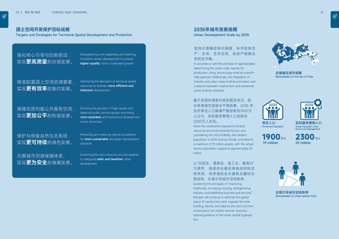 在城市规模方面,基于资源环境紧约束等因素,2035年深圳常住人口规模将严格控制在1900万人以内,实际服务管理人口控制在 2300万人左右,常住人口城镇化率达100%,户籍人口占常住人口比例达到50%以上。