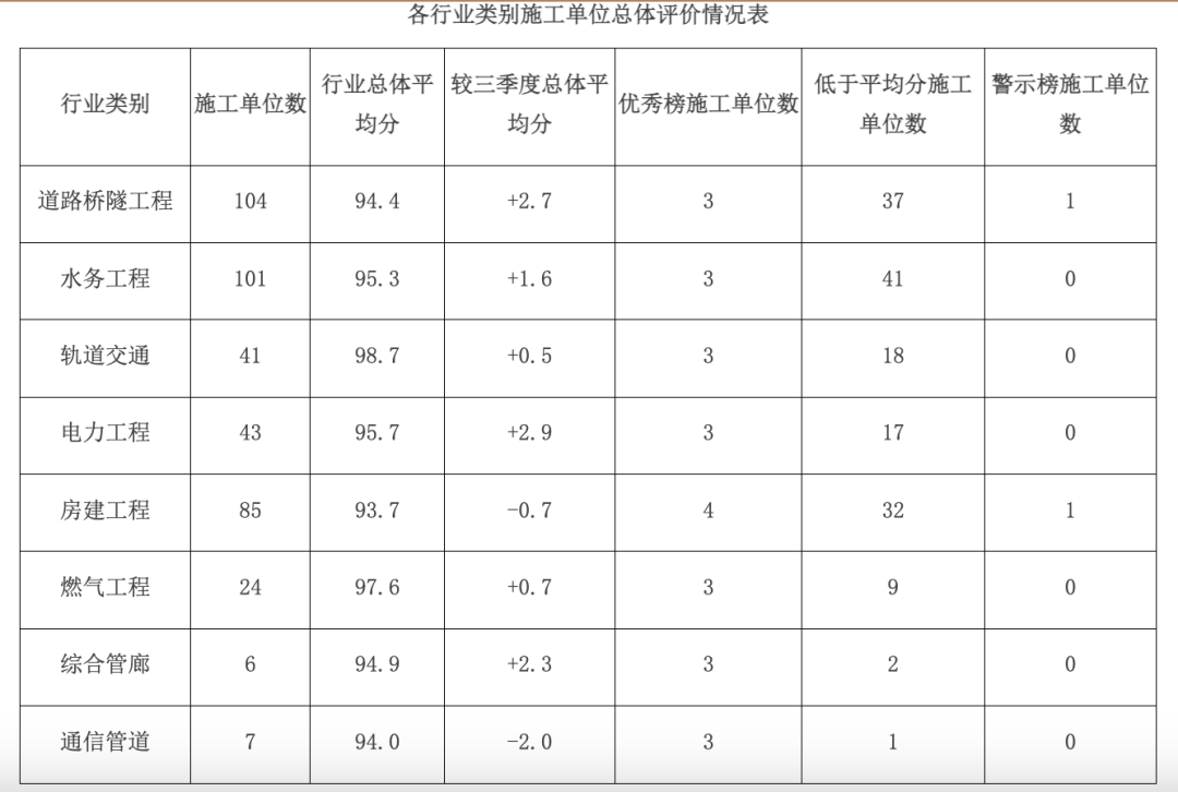 其中,轨道交通、燃气工程、电力工程类平均分相对较高(平均分95分以上);房建工程类平均分相对较低(平均分93.7分)。相比第三季度,除房建工程、通信管道2个行业类别平均分有所下降外,其他6个行业类别平均分均有所提升,其中道路桥梁工程、电力工程提升较大(分别提升2.7分和2.9分),主要是相关施工单位在落实施工围蔽、信息公示、道路修复质量等方面得分有所提升。