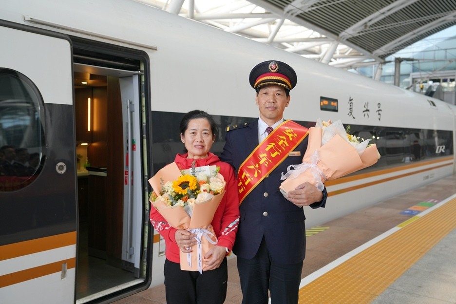 广州机务段广州南高铁运用车间组织人员在站台举办了接车仪式,车间主任为倪伟平披上绶带、献上鲜花,他的妻子也到场见证了这个光荣时刻。