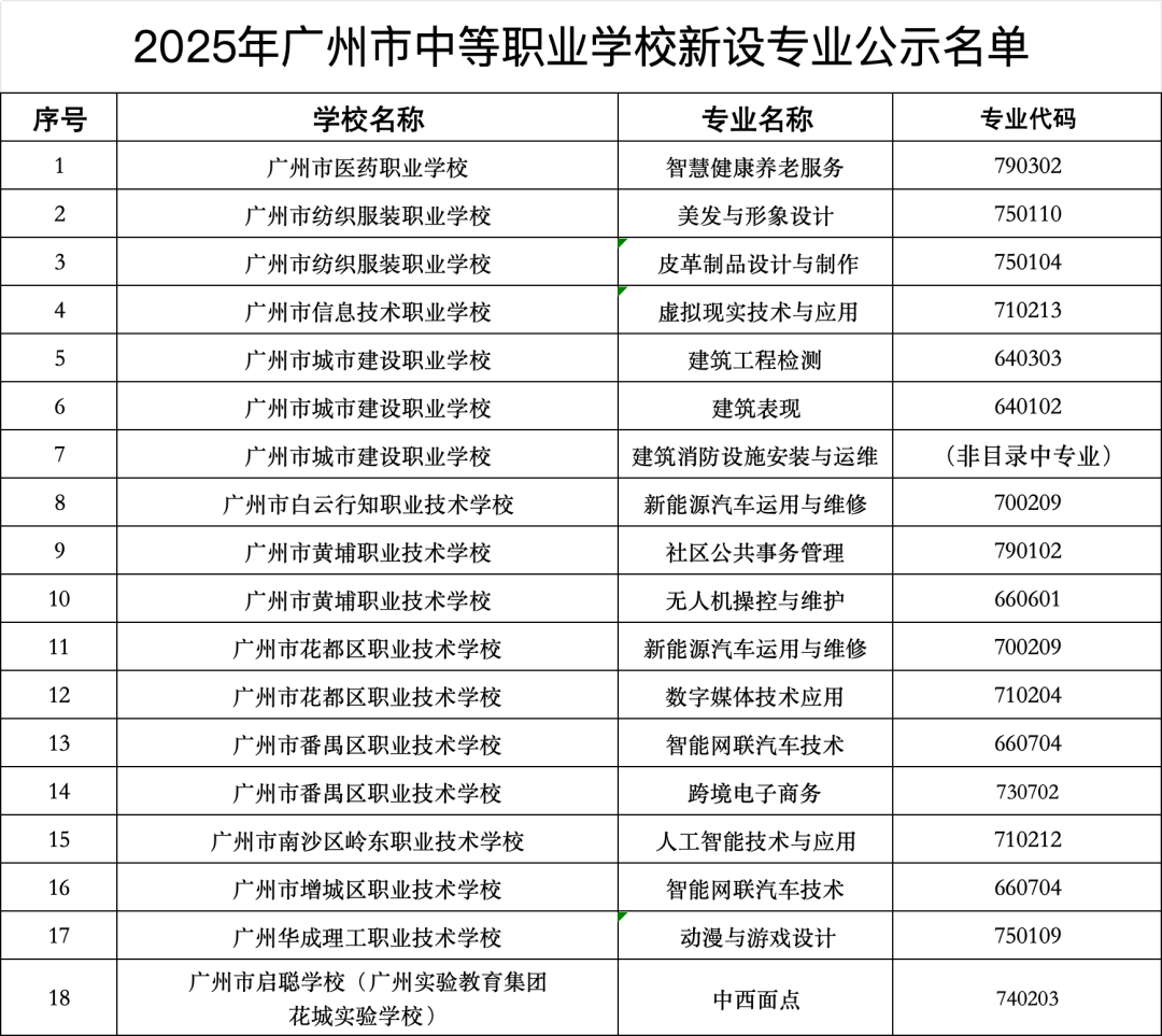 中考招生季即将来临,2月21日,广州市教育局官网发布关于公示2025年广州市中等职业学校新设专业、示范专业及校企合作项目名单的通知,公示时间为自通知印发之日起5个工作日。通知显示,广州12所中职学校拟设置18个新专业。