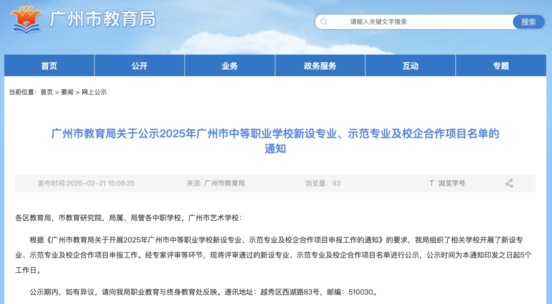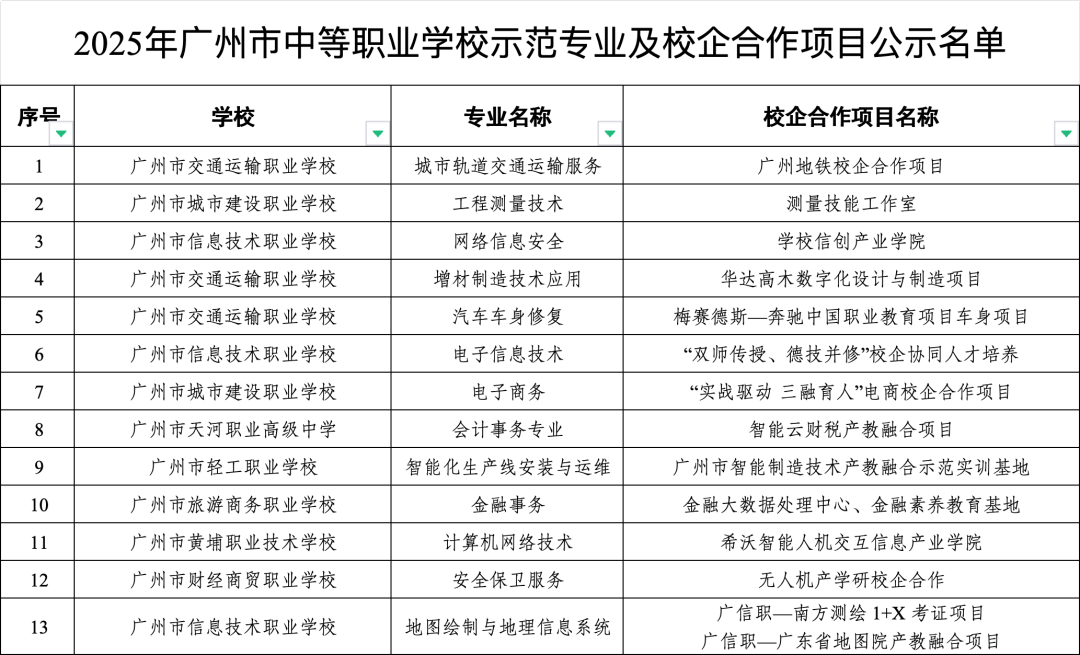此外,广州市教育局还公布了2025年广州市中等职业学校示范专业及校企合作项目公示名单。8所中职学校的13个专业及校企合作项目进入市级示范名单。