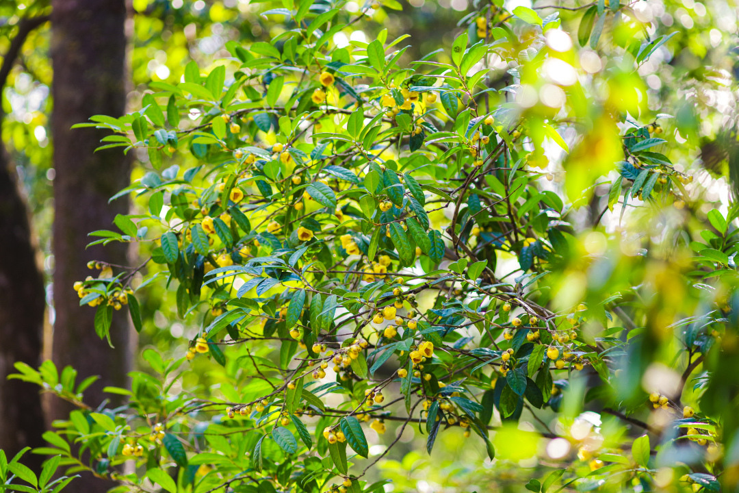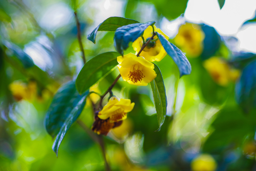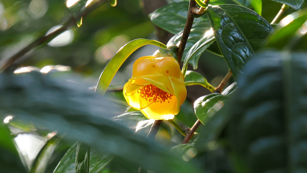近日在华南国家植物园,茶花中唯一金黄色花瓣、有“茶族皇后”美誉的金花茶在春节后迎来盛花期,为早春延续冬的浪漫。