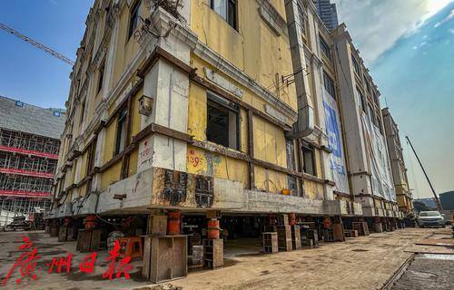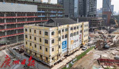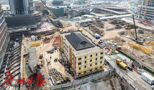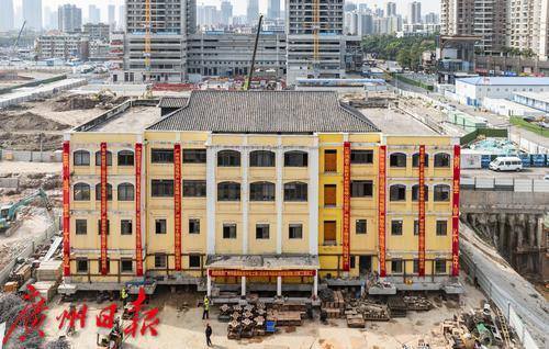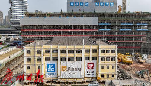 近日,广州荔湾区芳村大道,轰隆隆的中建五局白鹅潭项目部工地外,无数人从工地围挡旁走过,却不知一栋约4600吨重的文保建筑正在进行“搬家”。