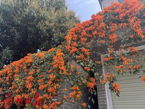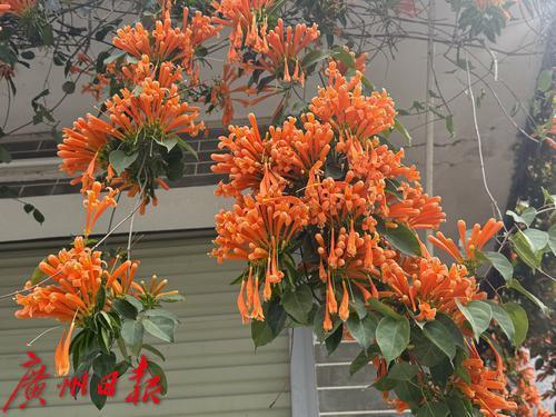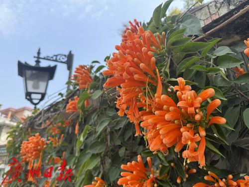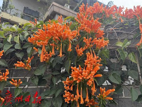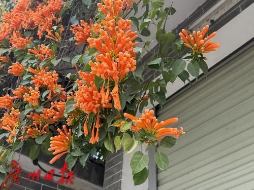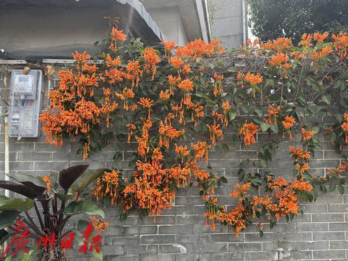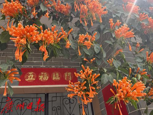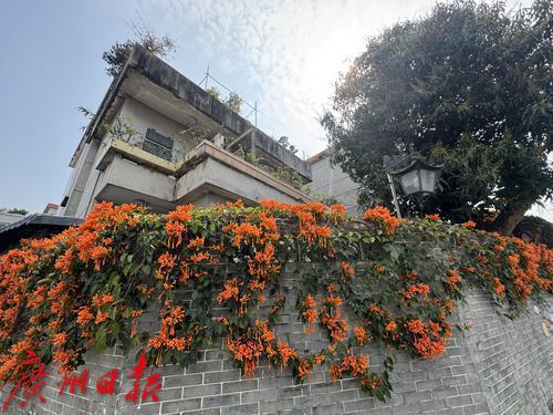 广州番禺大岭村,古村里的炮仗花盛开,围墙上满是橙色的花朵,吸引了众多游客观赏。