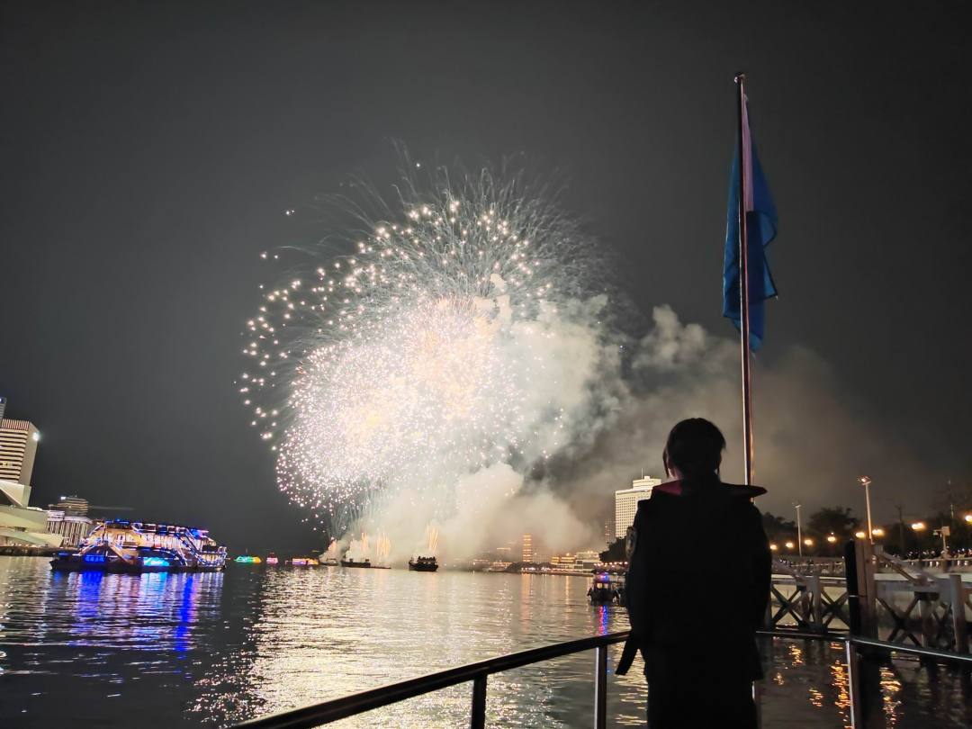 当烟花在夜空中绽放,照亮了整个白鹅潭,马己苗却无暇欣赏这美丽的景象。她和同事们在警戒线附近水域巡航值守,随时准备应对可能出现的突发情况。“烟花汇演的成功举办,离不开每一位海事人员的辛勤付出。看到市民们开心的笑容,我们觉得一切都是值得的。”马己苗说道。