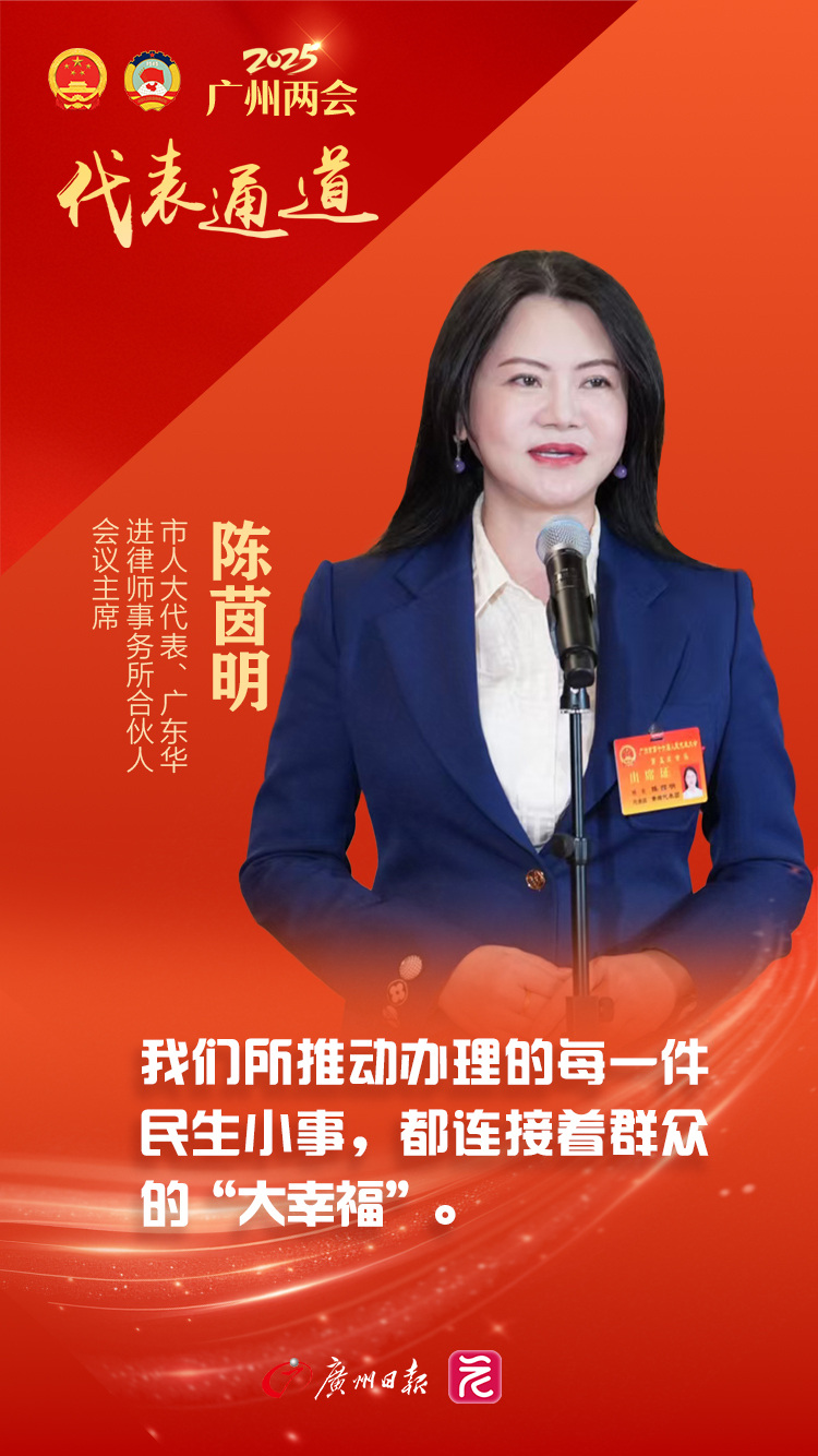 市人大代表、广东华进律师事务所合伙人会议主席陈茵明走上代表通道,自豪地说,“我认为代表的角色是‘桥梁’,将群众的期盼与呼声传递到决策过程是我们的职责和使命。”她列举了广州地铁13号线双岗站C出入口开通的实例。