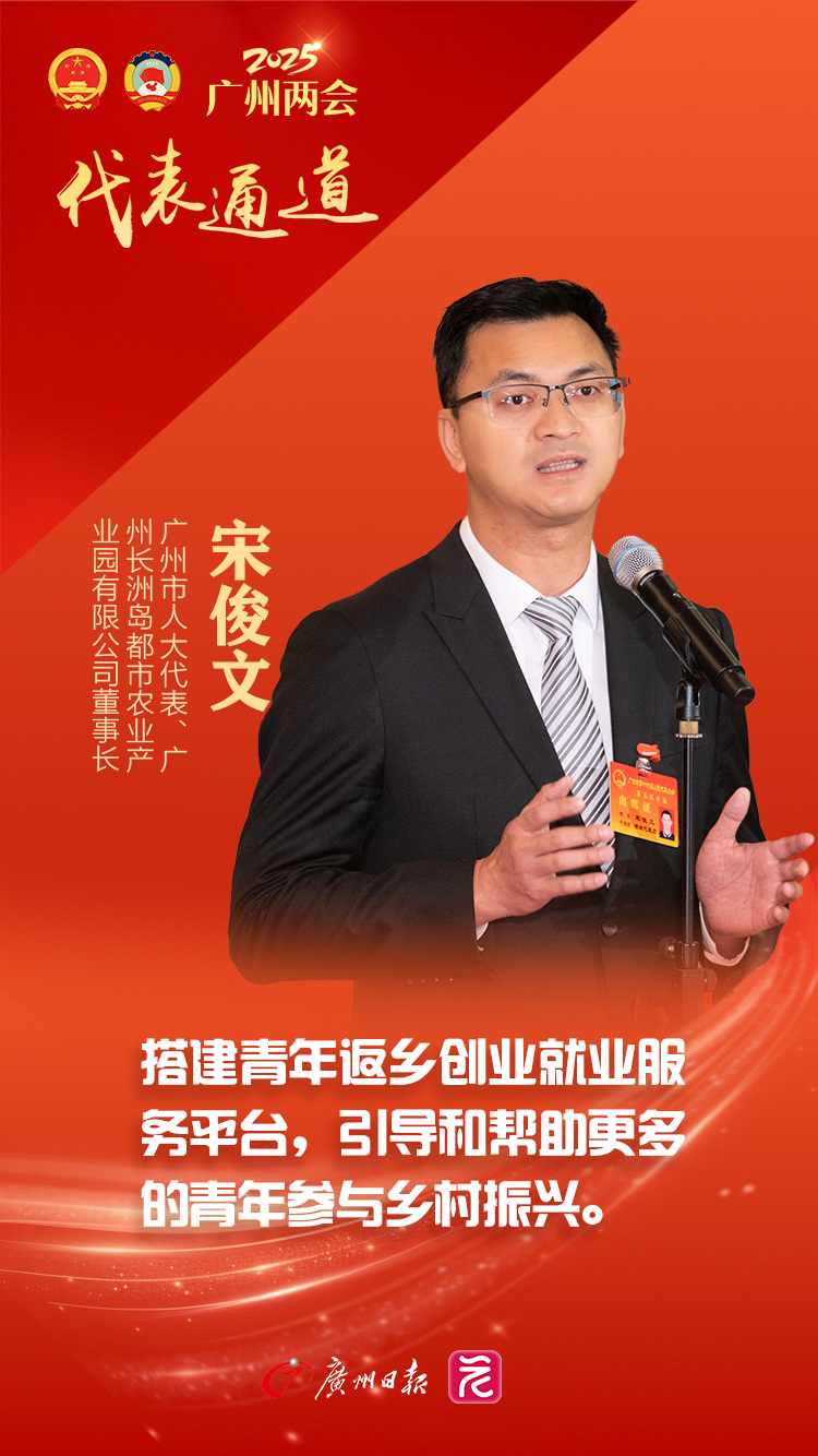 广州市人大代表、广州长洲岛都市农业产业园有限公司董事长宋俊文建议,进一步改善乡村创业就业环境和氛围,搭建青年返乡创业就业服务平台,引导和帮助更多的青年参与乡村振兴。