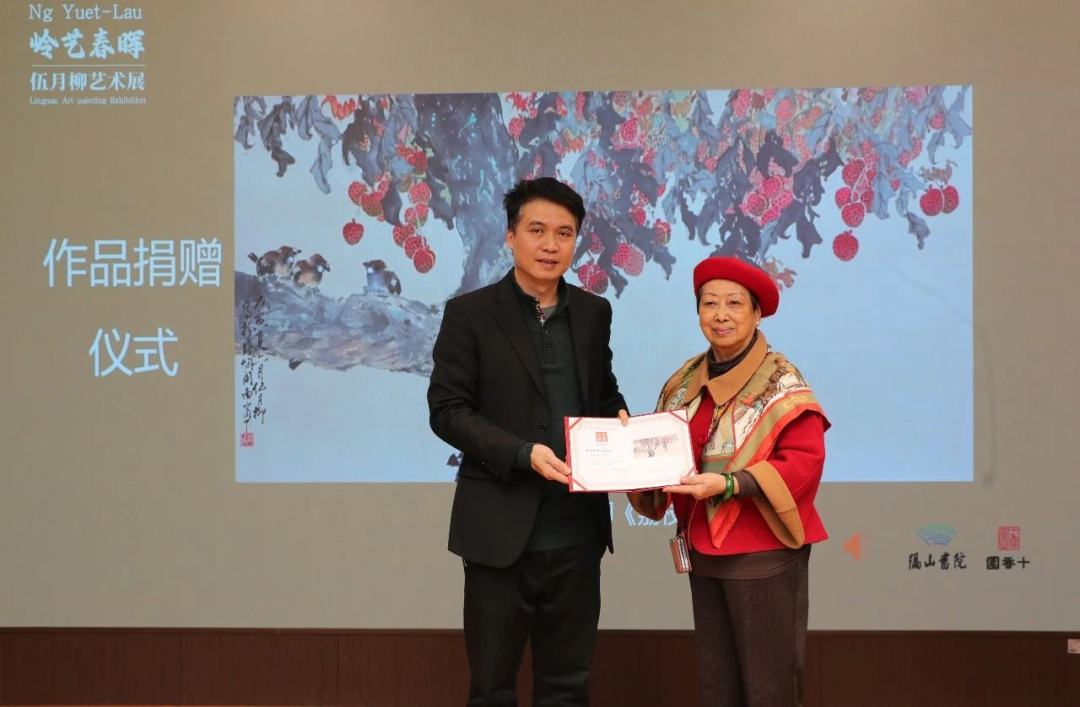 伍月柳(右)向十香园纪念馆捐赠作品《荔枝》