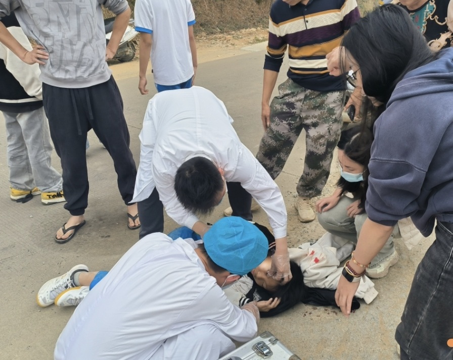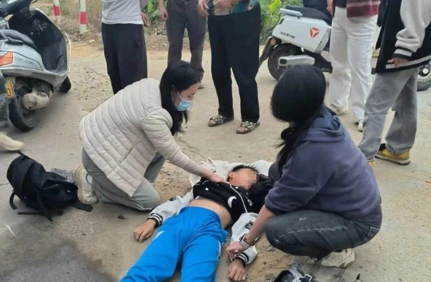 姐妹俩一听,车刚刹停就打开车门冲了下去,只见受伤的男学生仰躺地上,面色苍白,对旁人的呼喊已没有任何反应。见此,吴文婷跪地俯身实施紧急检查,手指触到其后脑勺时,掌心传来了黏腻触感,血肿已鼓胀如鸡蛋大小。