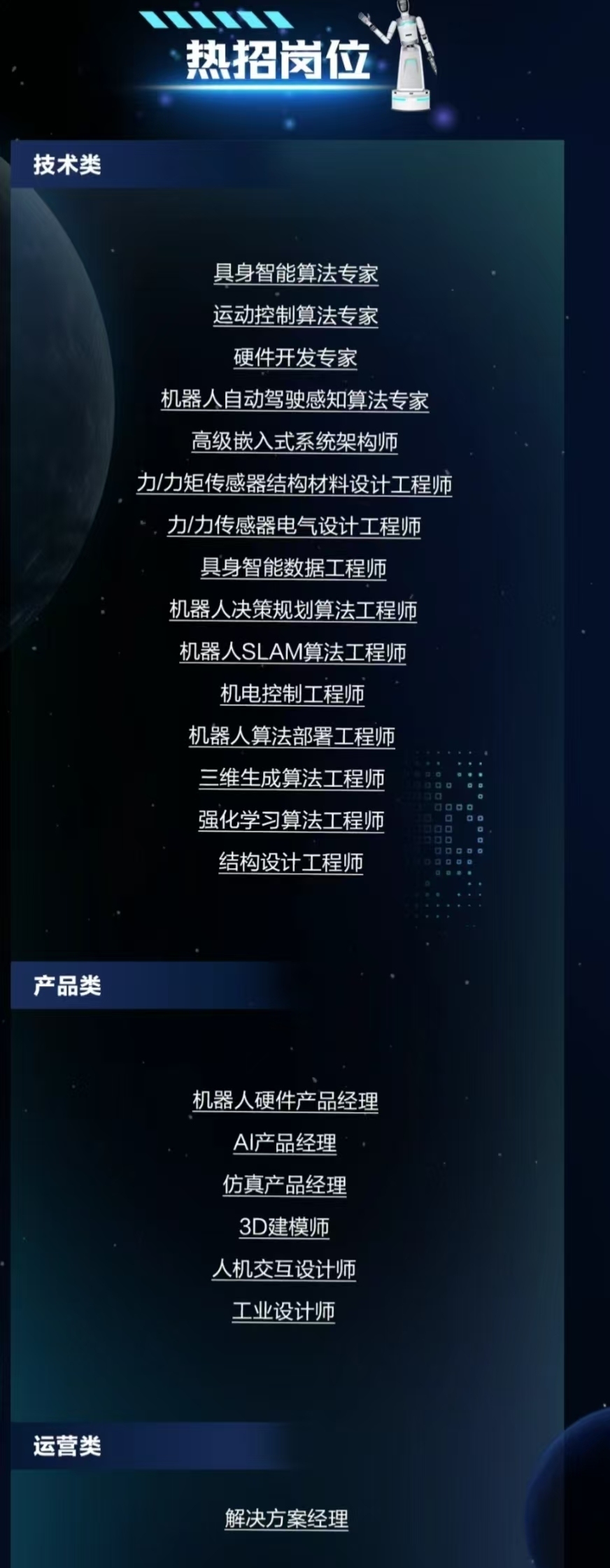 目前热招岗位包括技术类、产品类、运营类三大类型。其中,技术类包括具身智能算法专家、运动控制算法专家、机器人自动驾驶感知算法专家等。产品类包括机器人硬件产品经理、AI产品经理、仿真产品经理人机交互设计师、工业设计师等。运营类为解决方案经理。上述职位目前已经对外发布具体招聘细则。