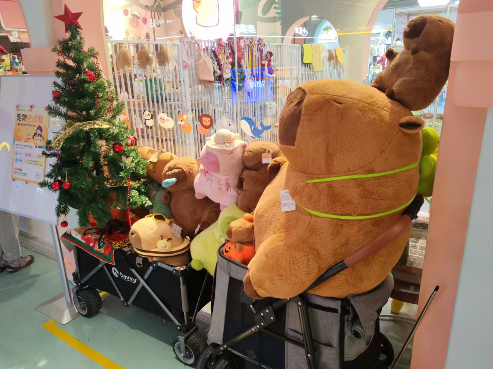 “看,有卡皮巴拉!”商场里,钢化玻璃结构包裹着的小店,小朋友围着一支趴在地垫上的水豚(capybara音译“卡皮巴拉”),品头论足。