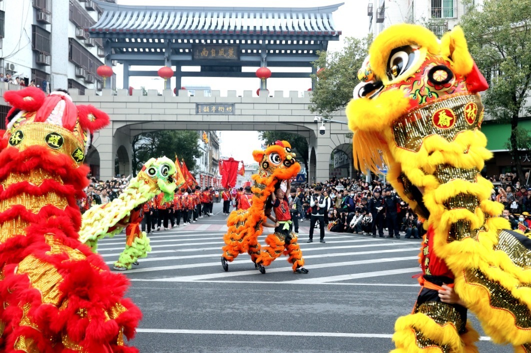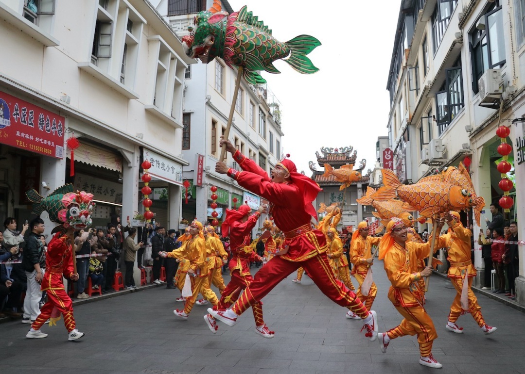 2月21日8时,鼓乐齐奏,标旗招展。在市民游客的翘首企盼中,3辆充满潮州特色的彩车从青龙古庙缓缓驶出,巡游活动正式拉开序幕。巡游队伍会聚了民间艺术团体、非遗代表性传承人、民俗表演者等,他们身着精美服饰,精神饱满,沿着牌坊街徐徐行进,缓缓展开一幅生动的潮州文化长卷,并向沿途观众传递新春的美好祝愿。