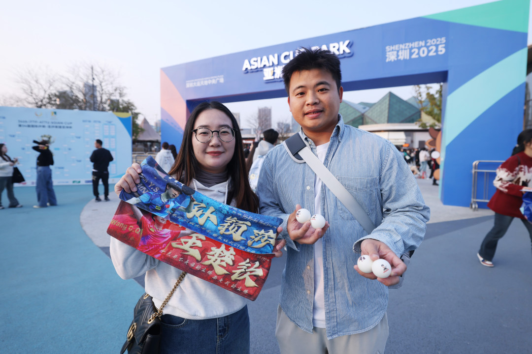 来自江门的梁美琪、伍嘉辉夫妇好不容易抢到20日至23日的比赛门票。在20日傍晚入场之前,他们专门排队购买4只王楚钦与孙颖莎的肖像球。在接受采访的时候,梁美琪专门从包里掏出王楚钦与孙颖莎的加油横幅,“这是我自己印的,很喜欢这两名国乒主力,这次专程来看他们比赛。”她告诉记者,虽然自己是从去年巴黎奥运会之后才成为了王楚钦和孙颖莎的球迷,但是,对于乒乓球这个项目以及中国乒乓球队,她是非常熟悉的。原来,梁美琪的爸爸是体育迷,家里的电视机只要一打开就是体育频道,她从小就爱看乒乓球比赛。她还记得2008年北京奥运会乒乓球女单决赛在张怡宁与王楠之间展开,当时张怡宁夺冠,王楠获得银牌。在决赛之后,王楠哭了,她当时在电视机前也跟着哭。