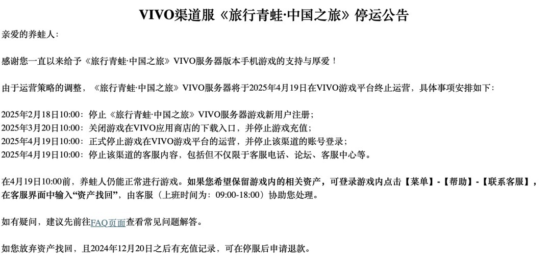 近日,阿里灵犀互娱旗下的游戏《旅行青蛙·中国之旅》官宣发布VIVO渠道服停运公告。官网公告显示,由于运营策略的调整,《旅行青蛙·中国之旅》VIVO服务器将于2025年4月19日在VIVO游戏平台终止运营。
