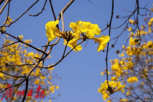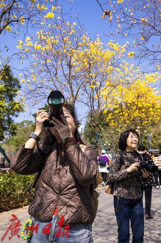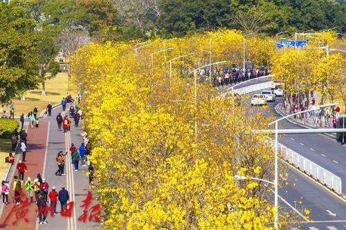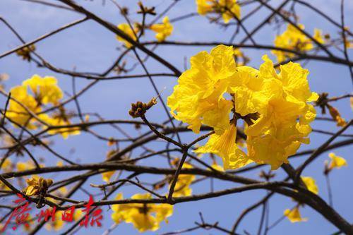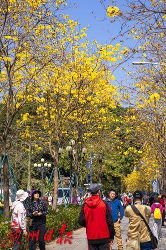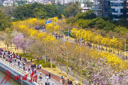 2月的广州春暖花开,海珠区环岛路的黄花风铃木迎来盛花期,金灿灿的花朵挂满枝头,宛如一条金色丝带蜿蜒在珠江沿岸,环岛路也限时变成“黄金海岸”,美不胜收。2月24日,记者在环岛路看到,众多市民游客慕名而来,漫步花海,拍照打卡,感受春日浪漫气息。黄花风铃木花期较短,想要一睹“满城尽带黄金甲”盛景的市民可要抓紧时间了。