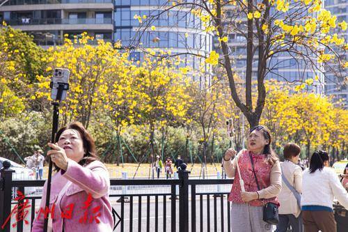 海珠区环岛路黄花风铃木盛放,吸引众多市民游客前来拍照打卡。