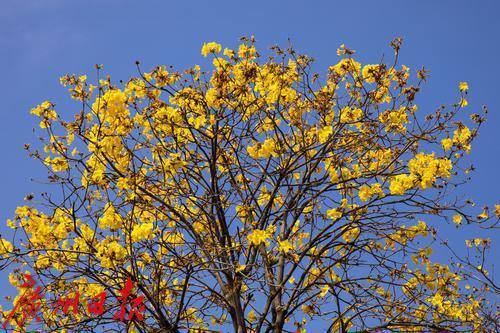 蓝天下绽放的黄花风铃木。