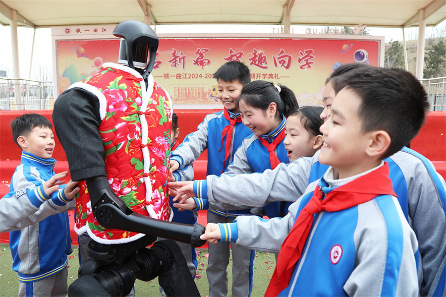 A Spring Festival Gala style robot from Unitree Robotics interacts with students during a school opening ceremony in Xi'an, Shaanxi province, on Feb 17. [QU XIAOGE/FOR CHINA DAILY]
