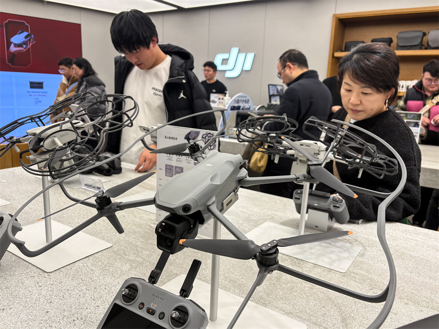 People experience products from Shenzhen-based drone manufacturer DJI at an outlet in Nanjing, Jiangsu province, on Feb 3. [CHINA DAILY]