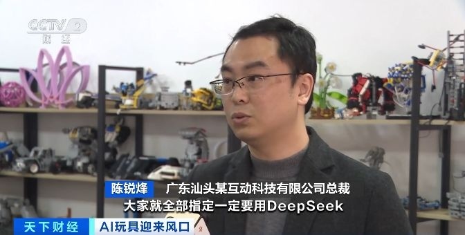 广东汕头某互动科技有限公司总裁 陈锐烽:现在这一波行情来了,大家全部要用DeepSeek,因为它的整个逻辑性、深度思考,能更清晰、更简洁。到现在为止,AI玩具意向订单已经几十万元了。
