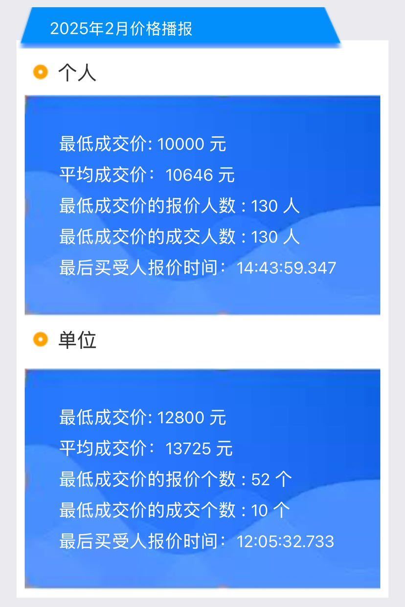 2月25日,2025年2月粤A车牌竞价结果出炉。具体来看,2月粤A车牌个人平均成交价为10646元,较上月10671元下降25元。130人以最低成交价10000元成交,与2024年8月至2025年1月粤A车牌个人最低成交价10000元持平。