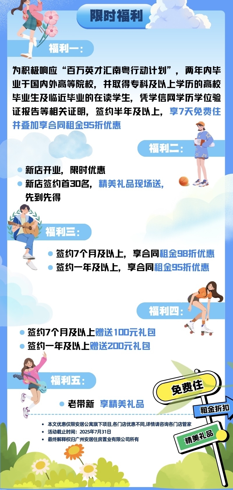 此次活动时间从即日起至2025年7月31日,面向高校应届毕业生及毕业两年内的青年人才。符合条件者可通过电话报名参与,成功申请后,即可享受“七日免费住”优惠或其他福利。入住后签约广州安居公寓半年以上,叠加享受合同租金95折优惠。