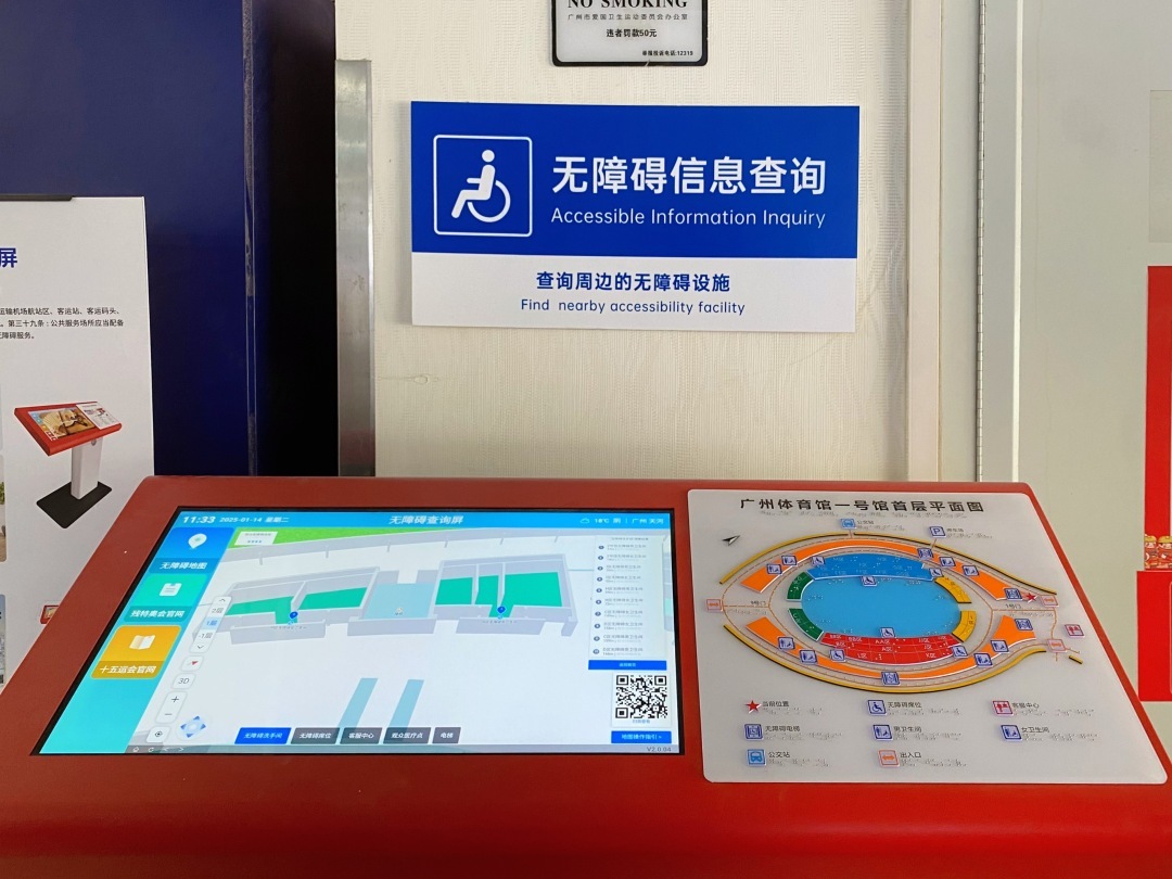 广州体育馆1号馆作为残特奥会轮椅篮球项目赛事的比赛场馆,目前已完成联合竣工验收并移交。场馆配备了无障碍查询屏和智能服务桩,为有障碍需求者提供便捷的出行指引及一键求助服务。现场设立无障碍服务中心,可为听力障碍者提供在线手语翻译、语音文字互转等服务。