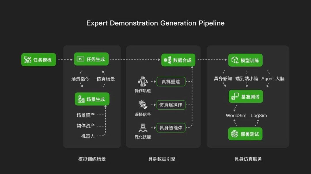 具体来说,凭借丰富多样的物体、场景和机器人模型所构建的大规模、高精度的三维资产库,结合高度逼真的视觉渲染和精确的物理模拟,以及任务与场景的自动化生成,AgiBot Digital World可以惟妙惟肖地模拟各种机器人训练场景。同时,仿真框架打造的多种专家轨迹生成策略,配合域随机化、数据增强等手段,能够自动生成多样、鲁棒的大规模专家轨迹数据,并且建立了贯穿专家轨迹生成、模型训练、基准测试、部署验证的完整评估流程。