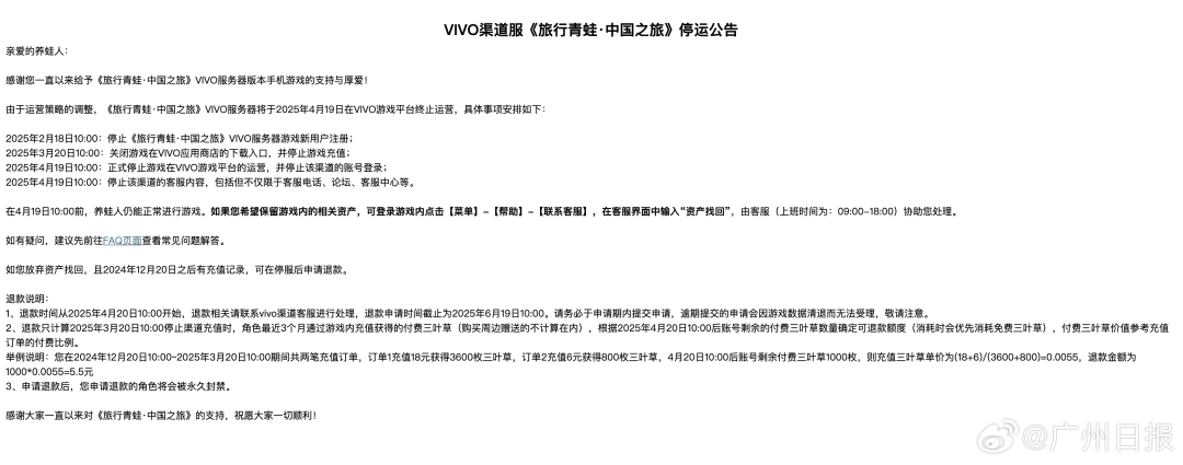 这几天,游戏《旅行青蛙·中国之旅》官网的一则停运公告引起了玩家们的讨论。官方宣布,由于运营策略调整,《旅行青蛙·中国之旅》VIVO服务器将在4月19日终止运营,玩家可申请退款。